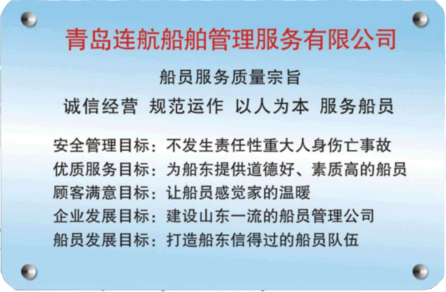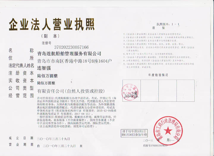 青島連航船舶管理服務(wù)有限公司(以下簡(jiǎn)稱公司)是經(jīng)中華人民共和國(guó)海事局批準(zhǔn)認(rèn)可的海員外派服務(wù)機(jī)構(gòu)(海員外派資質(zhì)證書編號(hào):HYWP05016),是國(guó)家工商行政管理局注冊(cè)批準(zhǔn)的股份制企業(yè),注冊(cè)資金600萬(wàn)元。公司主要業(yè)務(wù)是代理海船船員辦理申請(qǐng)培訓(xùn)、考試、申領(lǐng)證書等有關(guān)手續(xù),代理船員用人單位管理海船船員事務(wù),為國(guó)內(nèi)外航行海船提供配員與輸出等活動(dòng);同時(shí)提供信息咨詢、船舶技術(shù)咨詢、海事信息咨詢、經(jīng)濟(jì)信息咨詢、商務(wù)服務(wù)、船舶物料供應(yīng)、船舶維修、船舶代理貨運(yùn)代理等服務(wù)業(yè)務(wù)。