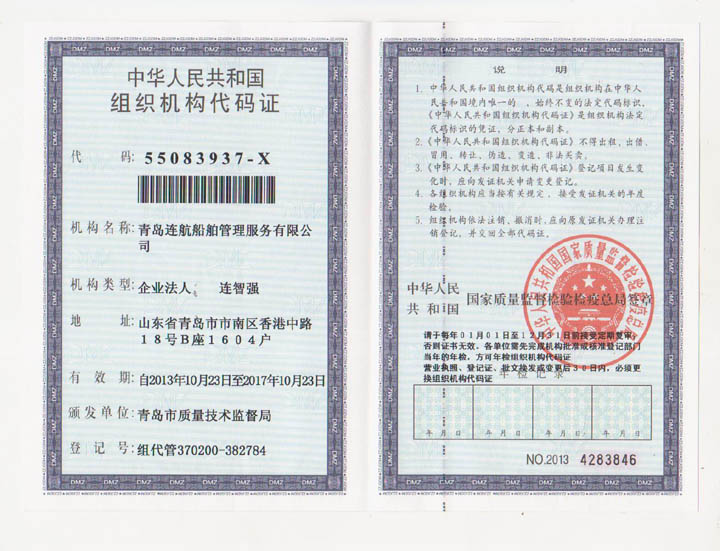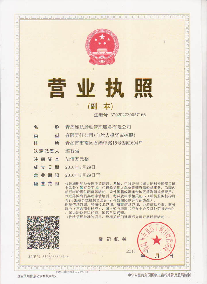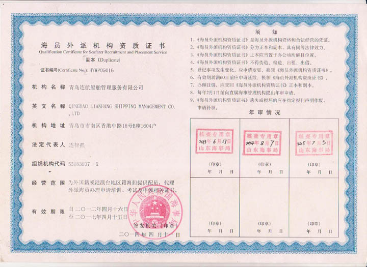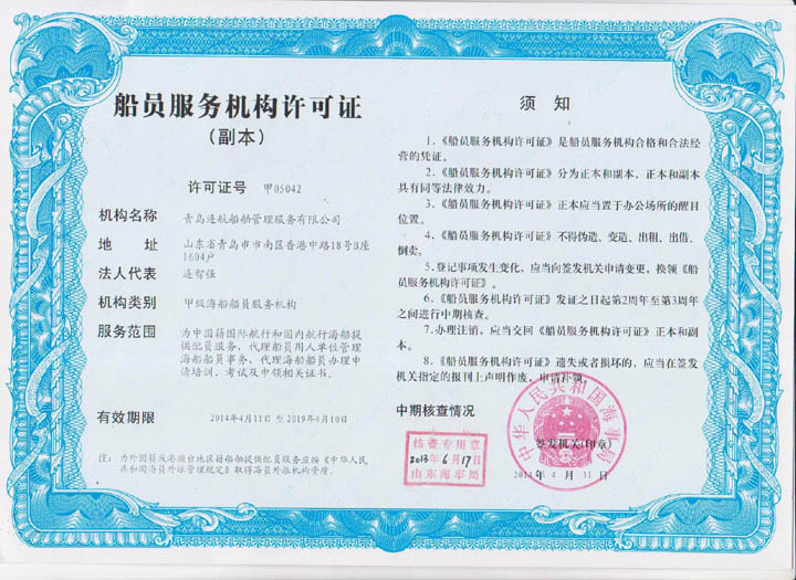 2012年04月青島連航船舶管理服務(wù)有限公司取得《海員外派機(jī)構(gòu)資質(zhì)證書》,為海洋船舶提供配員,代理船員用人單位管理海洋船舶船員事物,代理海洋船舶船員申請(qǐng)培訓(xùn)、考試、申請(qǐng)證書等業(yè)務(wù)。